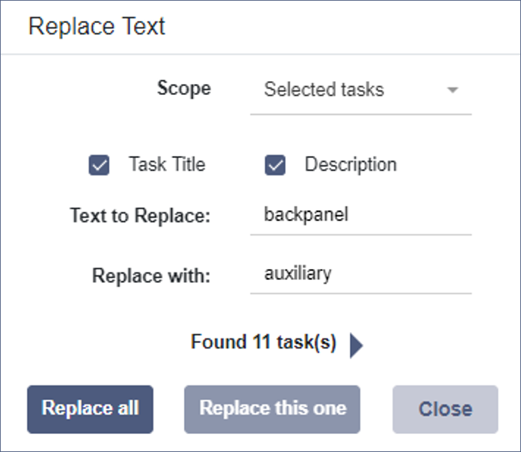 Text in task Titles and Descriptions can quickly and easily be replaced for one or more tasks.